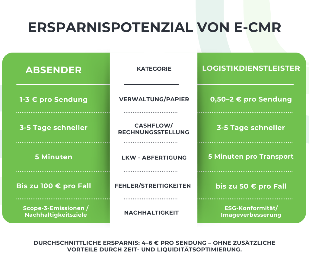 Die Umstellung auf elektronische Frachtbriefe (e-CMR) ist weit mehr als eine digitale Modernisierung – sie ist ein entscheidender Schritt hin zu einer intelligenteren, schnelleren und nachhaltigeren Logistik. Durch den Ersatz papierbasierter Dokumente durch sichere, digitale Prozesse können Transport- und Logistikunternehmen ihre Abläufe optimieren, Fehler deutlich reduzieren und messbare Einsparungen erzielen.